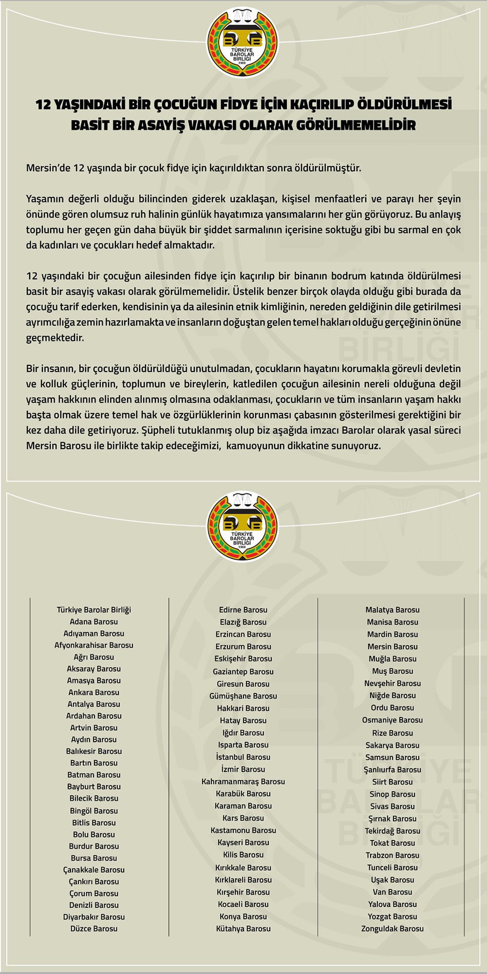 Bir insanın, bir çocuğun öldürüldüğü unutulmadan, çocukların hayatını korumakla görevli devletin ve kolluk güçlerinin, toplumun ve bireylerin, katledilen çocuğun ailesinin nereli olduğuna değil yaşam hakkının elinden alınmış olmasına odaklanması, çocukların ve tüm insanların yaşam hakkı başta olmak üzere temel hak ve özgürlüklerinin korunması çabasının gösterilmesi gerektiğini bir kez daha dile getiriyoruz. Şüpheli tutuklanmış olup biz aşağıda imzacı Barolar olarak yasal süreci Mersin Barosu ile birlikte takip edeceğimizi, kamuoyunun dikkatine sunuyoruz.