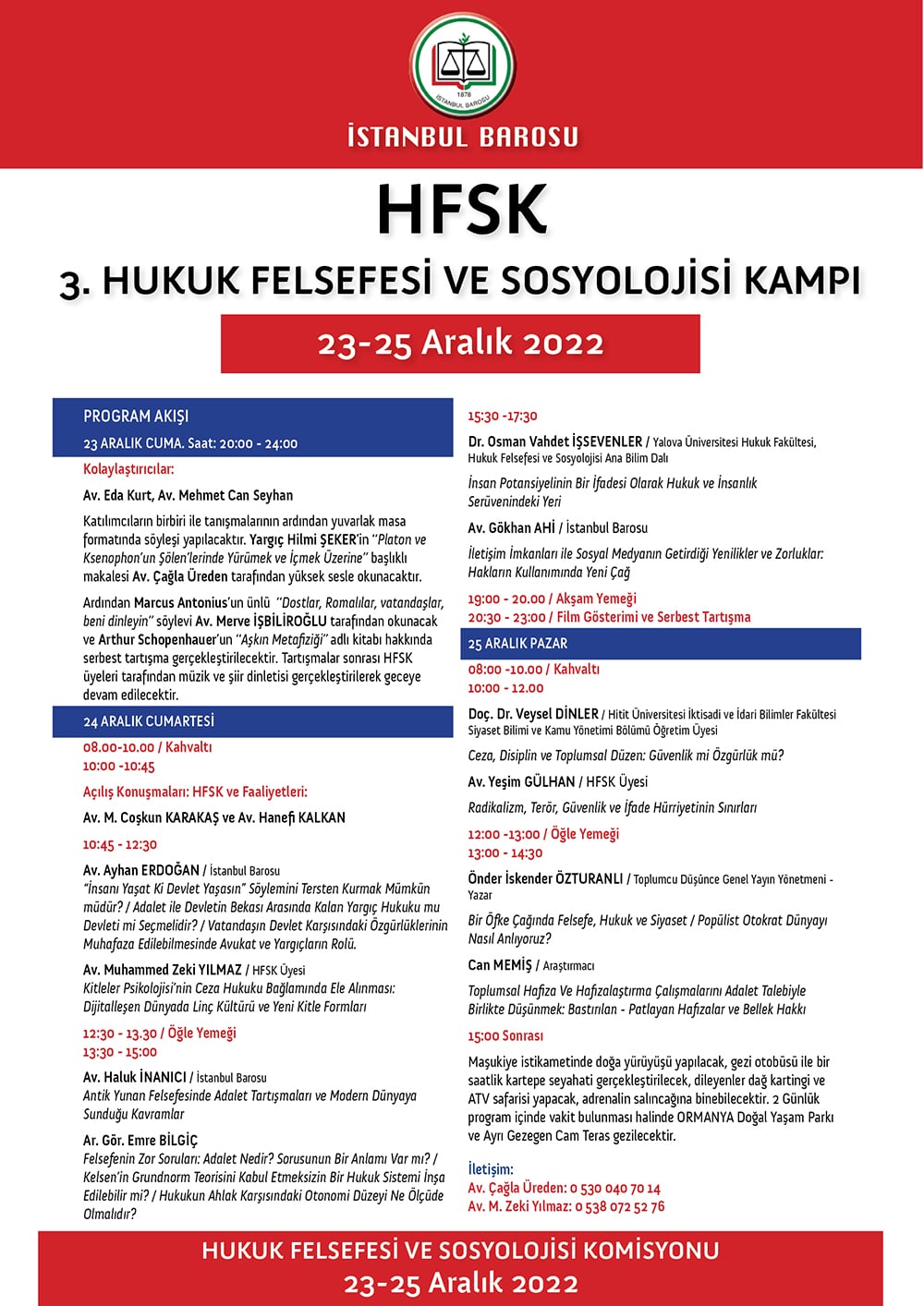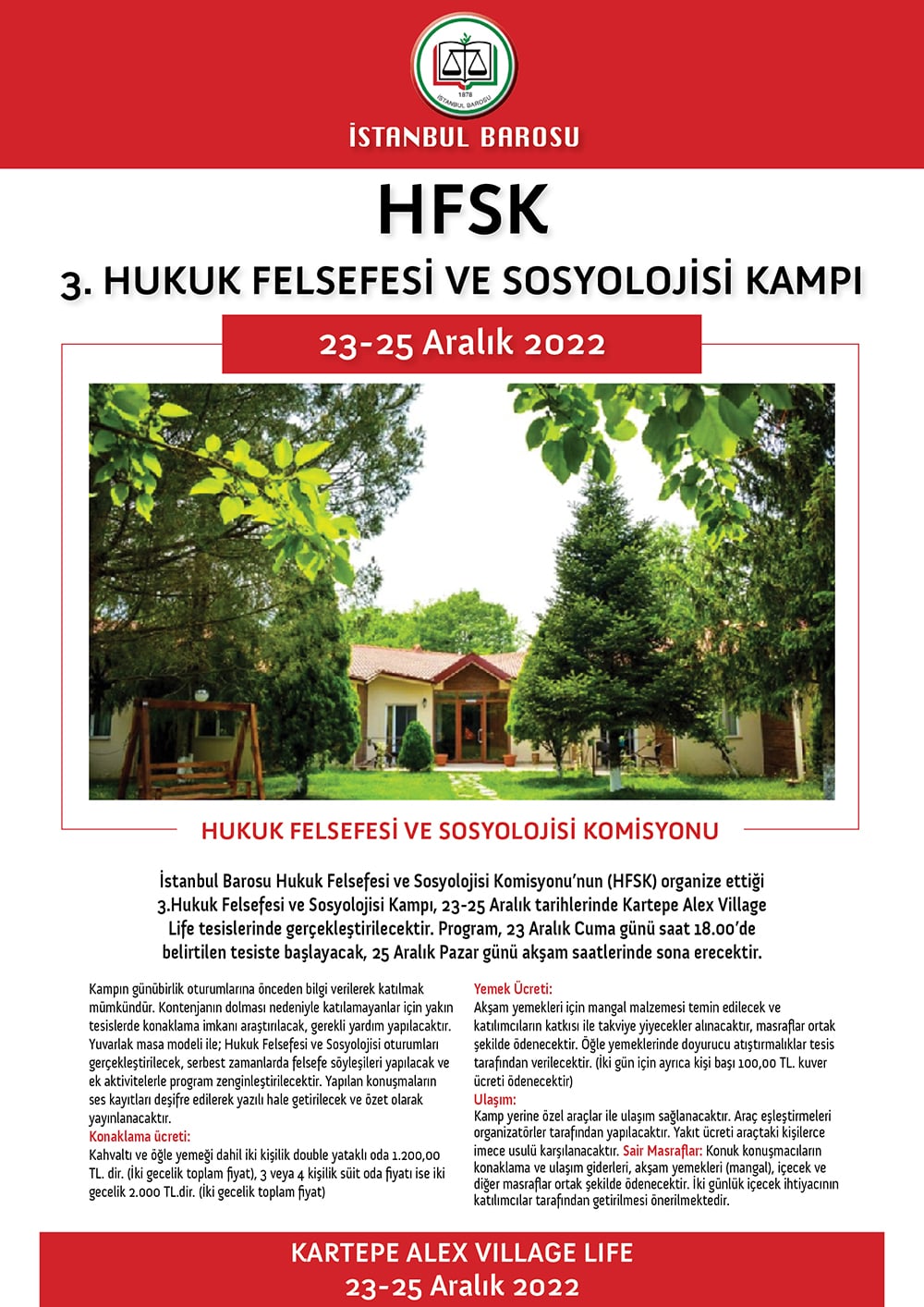 İstanbul Barosu Hukuk Felsefesi ve Sosyolojisi Komisyonu’nun(HFSK) organize ettiği "3. Hukuk Felsefesi ve Sosyolojisi Kampı" 23-25 Aralık tarihlerinde Kartepe Alex Village Life tesislerinde gerçekleştirilecektir.