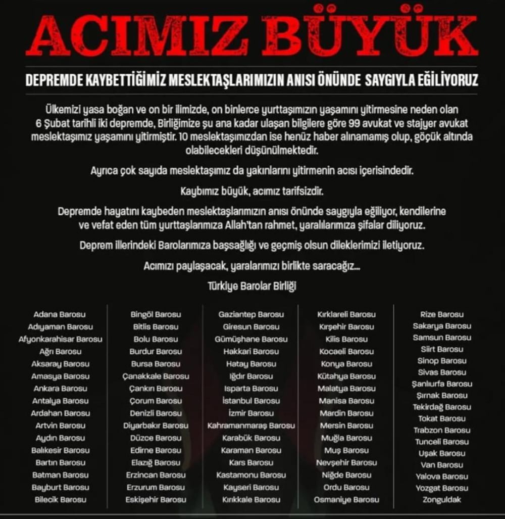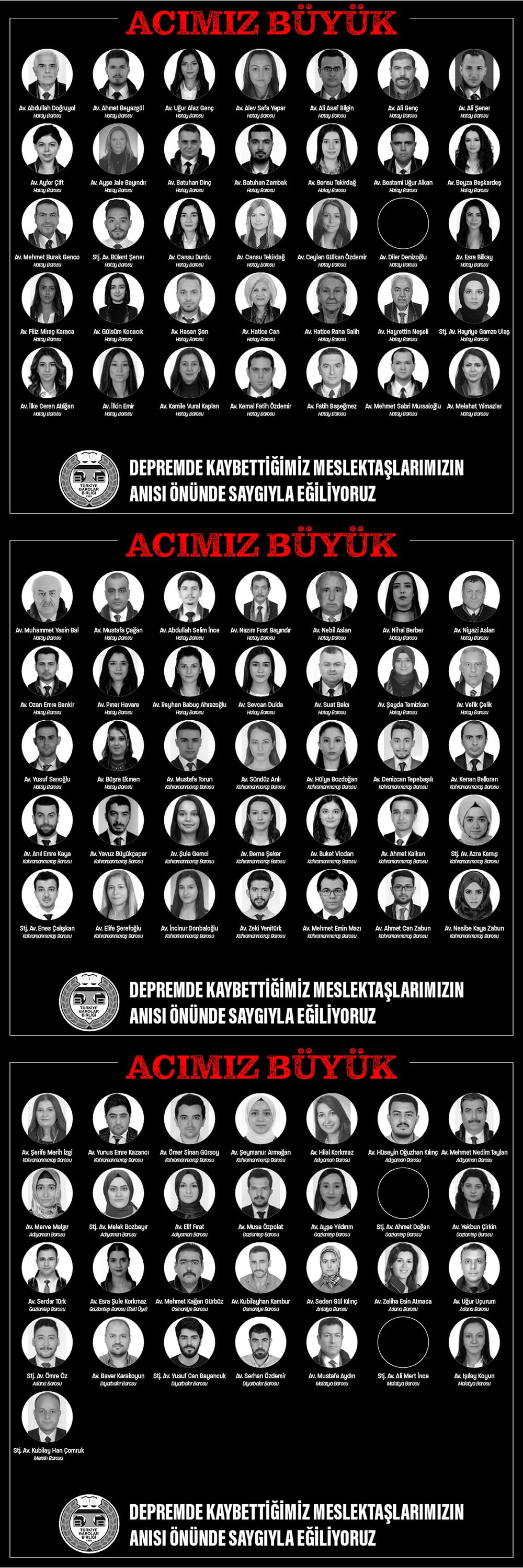 Ülkemizi yasa boğan ve on bir ilimizde, on binlerce yurttaşımızın yaşamını yitirmesine neden olan 6 Şubat tarihli iki depremde, Birliğimize şu ana kadar ulaşan bilgilere göre 99 avukat ve stajyer avukat meslektaşımız yaşamını yitirmiştir. 10 meslektaşımızdan ise henüz haber alınamamış olup, göçük altında olabilecekleri düşünülmektedir.