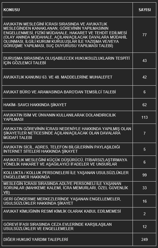 Avukat Hakları Merkezi'ne yapılan başvuruların sayısal dağılımı tablosu: