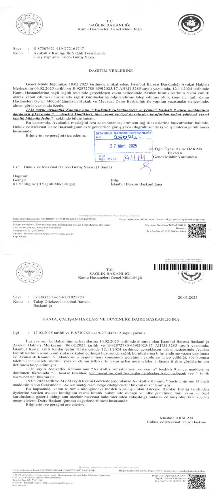 İstanbul Barosu Başkanlığı tarafından, avukatlık kimliklerinin sağlık kuruluşlarında resmî kimlik olarak kabul edilmemesine ilişkin uygulamalar üzerine, 6 Şubat 2025 tarih ve 5285 sayılı yazı ile T.C. Sağlık Bakanlığı’na başvuruda bulunulmuştur. Söz konusu yazıda, avukat kimliğinin kamu kurumlarında resmî kimlik olarak geçerli olması gerektiği vurgulanmış ve bu hususta gerekli düzenlemelerin yapılması talep edilmiştir.
