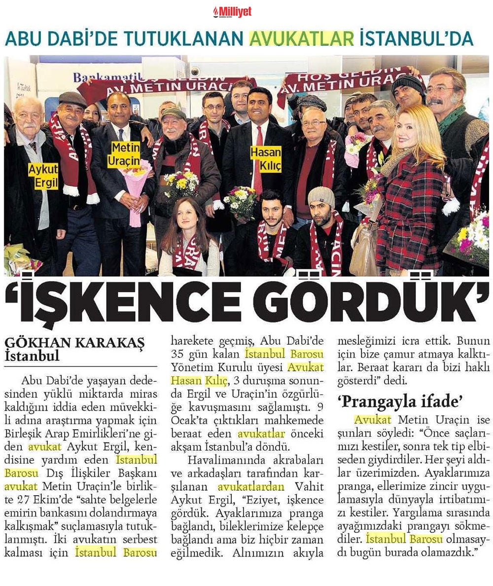 Bir dava dosyasındaki belgelerin doğruluğunu araştırma nedeniyle Birleşik Arap Emirlikleri'nde iken (BAE) 28 Ekim 2016’da tutuklanan baromuz üyesi meslektaşlarımız Aykut Ergil ve Metin Uracin beraat ederek yurda döndü.