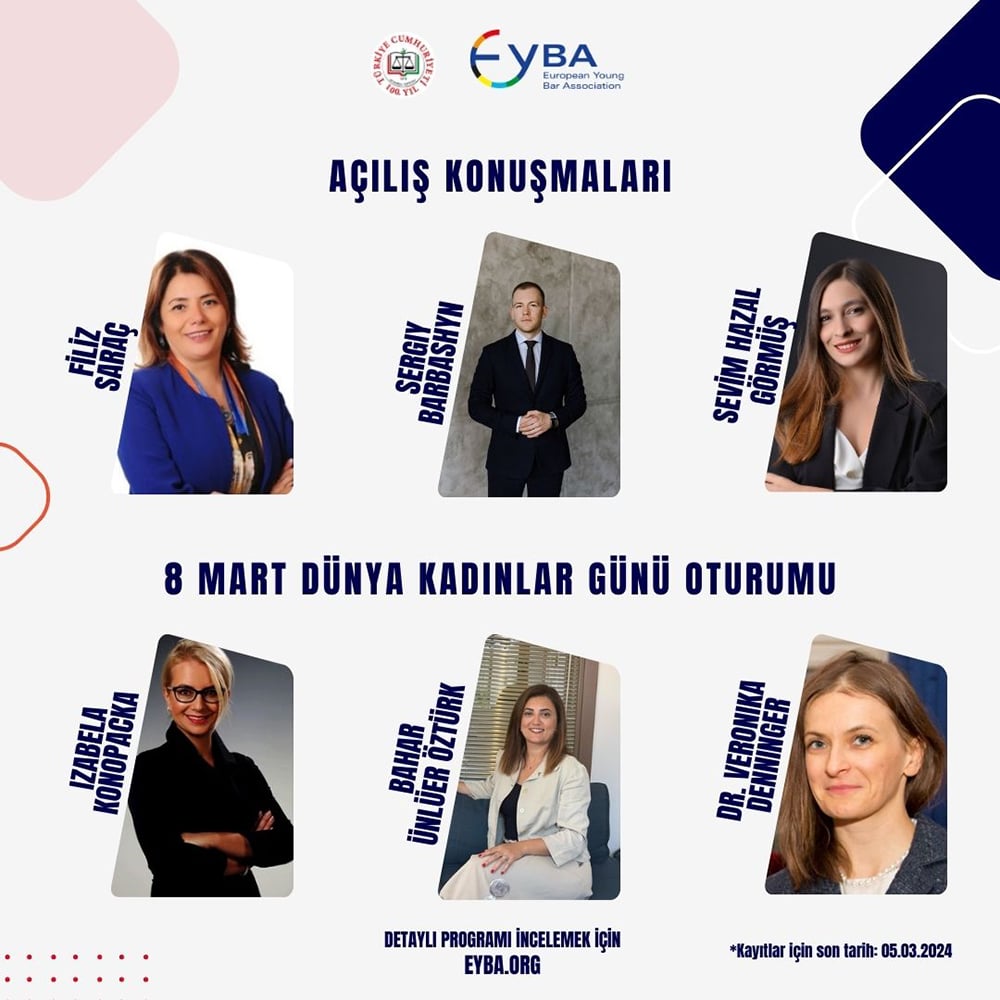 8 Mart 2024 tarihli akademik oturumlar için, İstanbul Barosu üyelerine özel 50 kişilik kontenjan bulunmaktadır. Katılım ücreti öğle yemeği dahil olmak üzere 2.000 TL'dir ve kayıt için eyba2024@istanbulbarosu.org.tr adresine e-posta gönderilmesi gerekmektedir.