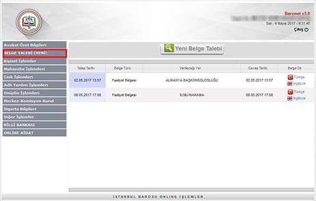 Baromuz tarafından yapılan yeni düzenleme ile Faaliyet Belgenizi Baromuza gelmeden ve kargo gerektirmeden hızlı bir şekilde BARONET üzerinden talep edip anında alabilirsiniz.