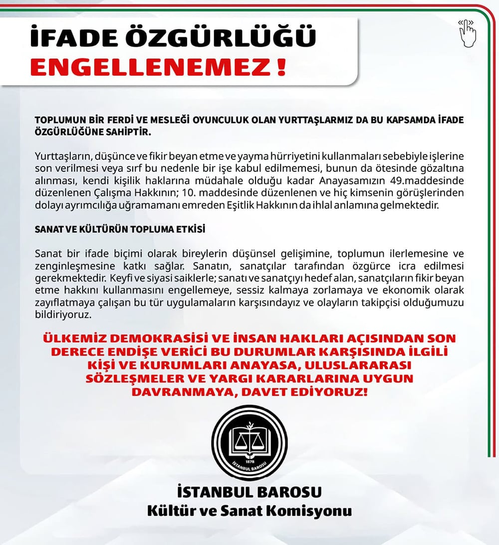 8 Nisan 2025İfade Özgürlüğü Engellenemez! İfade özgürlüğü kapsamındaki açıklamaları nedeniyle yurttaşlarımızın yaptırım tehdidiyle karşı karşı bırakılması kabul edilemez! İlgili tüm kişi ve kurumları Anayasaya, uluslararası sözleşmelere ve yargı kararlarına uygun davranmaya davet ediyoruz! Kategori:HaberlerPaylaş