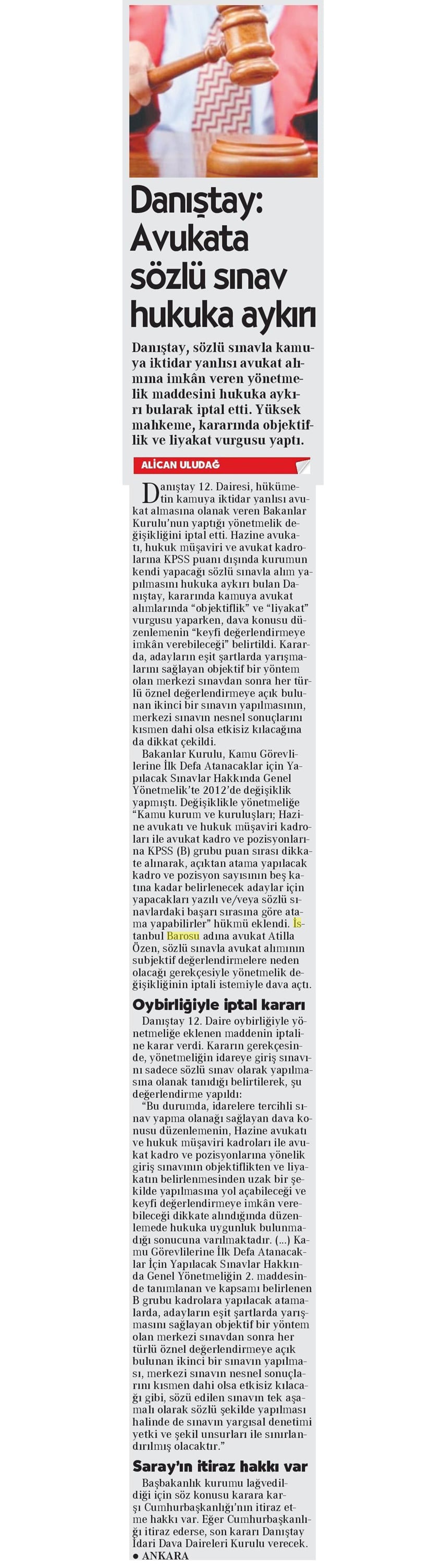 Kamuya hazine avukatı, hukuk müşaviri ve avukat alımlarında ÖSYM tarafından yapılan merkezi sınav olan Kamu Personel Seçme Sınavı dışında yazılı ve/veya sözlü olarak gerçekleştirilebilecek ikinci bir sınavın yapılmasını öngören, 03.10.2012 gün ve 28430 sayılı Resmi Gazetede yayımlanan Kamu Görevlerine İlk Defa Atanacaklar İçin Yapılacak Sınavlar Hakkında Genel Yönetmelikte Değişiklik Yapılmasına Dair Yönetmeliğin Ek-6. maddesinin iptali istemi ile İstanbul Barosu tarafından açılan davada, Danıştay 12. Dairesi’nin 08.02.2018 gün ve 2016/9090 E. 2018/528 K. no’lu kararı ile;