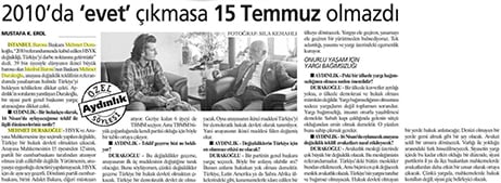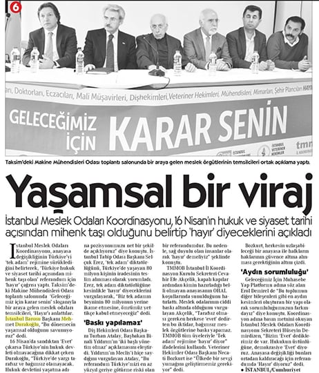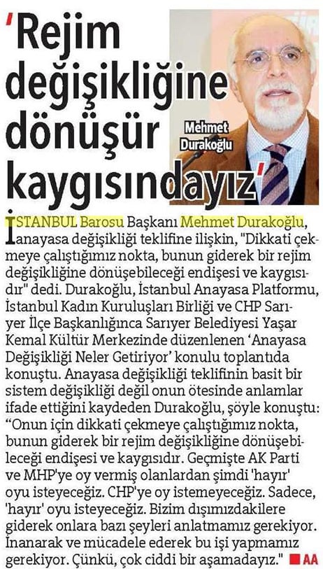 İstanbul Barosu Başkanı Av. Mehmet Durakoğlu, anayasa değişikliğiyle getirilmek istenen sistemin sakıncalarını anlatmak üzere çeşitli salon toplantılarına katıldı. Buralarda yaptığı konuşmalarda, eğer değişiklikler 2010 referandumunda olduğu gibi kabul edilecek olursa Türkiye’nin karşı karşıya kalacağı ağır sorunların neler olabileceğini anlattı.