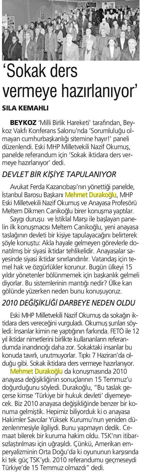 Beykoz Milli Birlik Hareketi tarafından 5 Şubat 2017 Pazar günü Beykoz Vakfı Konferans Salonunda düzenlenen panele İstanbul Barosu Başkanı Av. Mehmet Durakoğlu konuşmacı olarak katıldı. Eski MHP Milletvekili Nazif Okumuş’un yönettiği panelde konuşan Durakoğlu 2010 anayasa değişikliği sonuçlarının 15 Temmuz’u doğurduğunu söyledi. Durakoğlu “Referanduma sunulacak anayasa değişiklikleri de geçerse Türkiye’ye artık bir hukuk devleti diyemeyeceğiz. Biz 2010 anayasa değişikliğinde benzer konuma gelmiştik. Biliyorduk ki o anayasa Hâkimler ve Savcılar Yüksek Kurulunun yeniden düzenlenmesiyle ilgiliydi. Bunu yapmayın dedik. Cemaeat bilerek bu kuruma hâkim oldu. TSK’nın itibarsızlaştırılması için uğraşıldı. Çünkü Amerikan emperyalizminin Orta Doğu’daki oyununun karşısındaki tek güç TSK’ydı. 2010 referandumu olmasaydı, 15 Temmuz olayını yaşamayacaktık” dedi