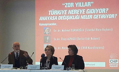 İstanbul Anayasa Platformu, İstanbul Kadın Kuruluşları Birliği ve CHP Sarıyer İlçe Başkanlığı tarafından 15 Ocak 2017 Pazar günü Sarıyer Belediyesi Yaşar Kemal Kültür Merkezinde düzenlenen ‘Anayasa Değişikliği Neler Getiriyor’ konulu panelin açılış konuşmasını İstanbul Barosu Başkanı Av. Mehmet Durakoğlu yaptı. Durakoğlu, anayasa değişikliğinin basit bir sistem değişikliği olmadığına dikkat çekti. Değişikliklerin onun ötesinde anlamlar taşıdığını belirten Durakoğlu, bunun giderek bir rejim değişikliğine dönüşebileceği endişesi ve kaygısının taşındığını söyledi. Durakoğlu şöyle devam etti: “AKP ve MHP’ye oy vermiş olanlardan şimdi ‘Hayır’ oyu isteyeceğiz. Bizim dışımızdakilere giderek onlara bazı şeyler anlatmamız gerekiyor. İnanarak ve mücadele ederek bu işi yapmamız gerekiyor. Çünkü çok ciddi bir aşamadayız.”