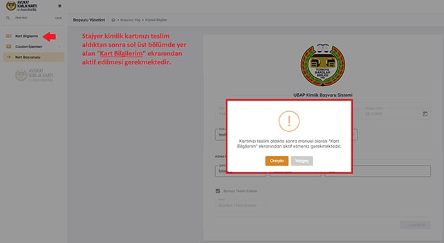 Kimlik kartınız teslim alındıktan sonra, sistemde sol üstte bulunan “Kart Bilgilerim” ekranına girerek kartı manuel olarak aktif etmeniz gerekmektedir.
