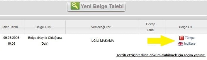 3-Açılan sayfada “Yeni Belge Talebi” butonuna tıklayarak talep etmek istediğiniz belge türünü seçiniz ve talebinizi oluşturunuz.